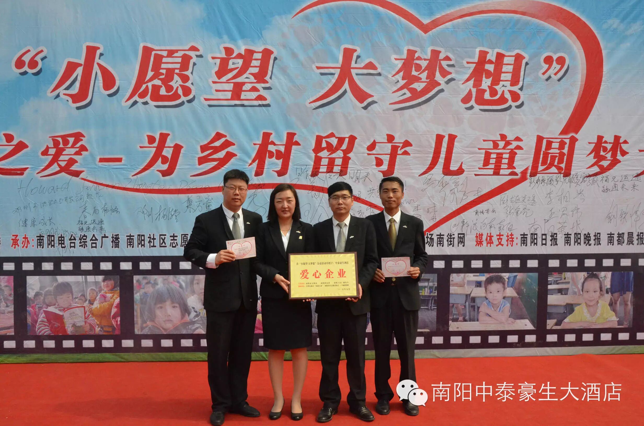 中泰豪生大酒店自2012年开业以来,我们坚持力所能及的去帮助更多的人筑梦未来。2013年12月,我们参与组织“1+1=爱”公益捐助活动,为南召贫困山区孩子捐献书籍和衣物。